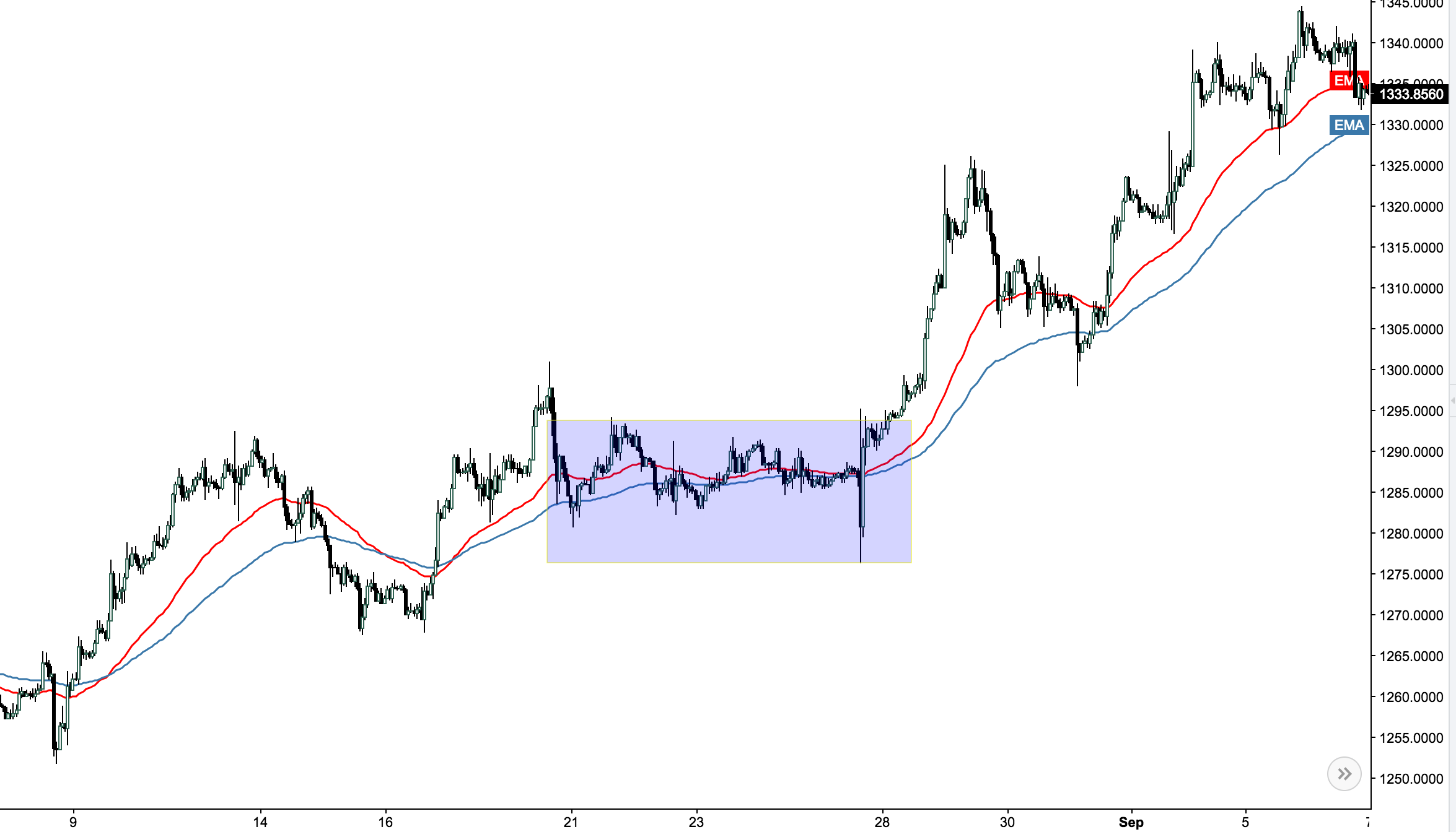 Trhy se bohužel nepohybují pouze v trendu, ale hlavně v chopu. Chop je stav, kdy se trh rozhoduje, kterým směrem se vydá. Často to vypadá jako naprostý chaos, ve kterém se téměř nedá obchodovat. A protože nejvíce peněz můžeme vydělat hlavně v trendujících trzích, klouzavé průměry nám pomohou identifikovat a odfiltrovat chop.