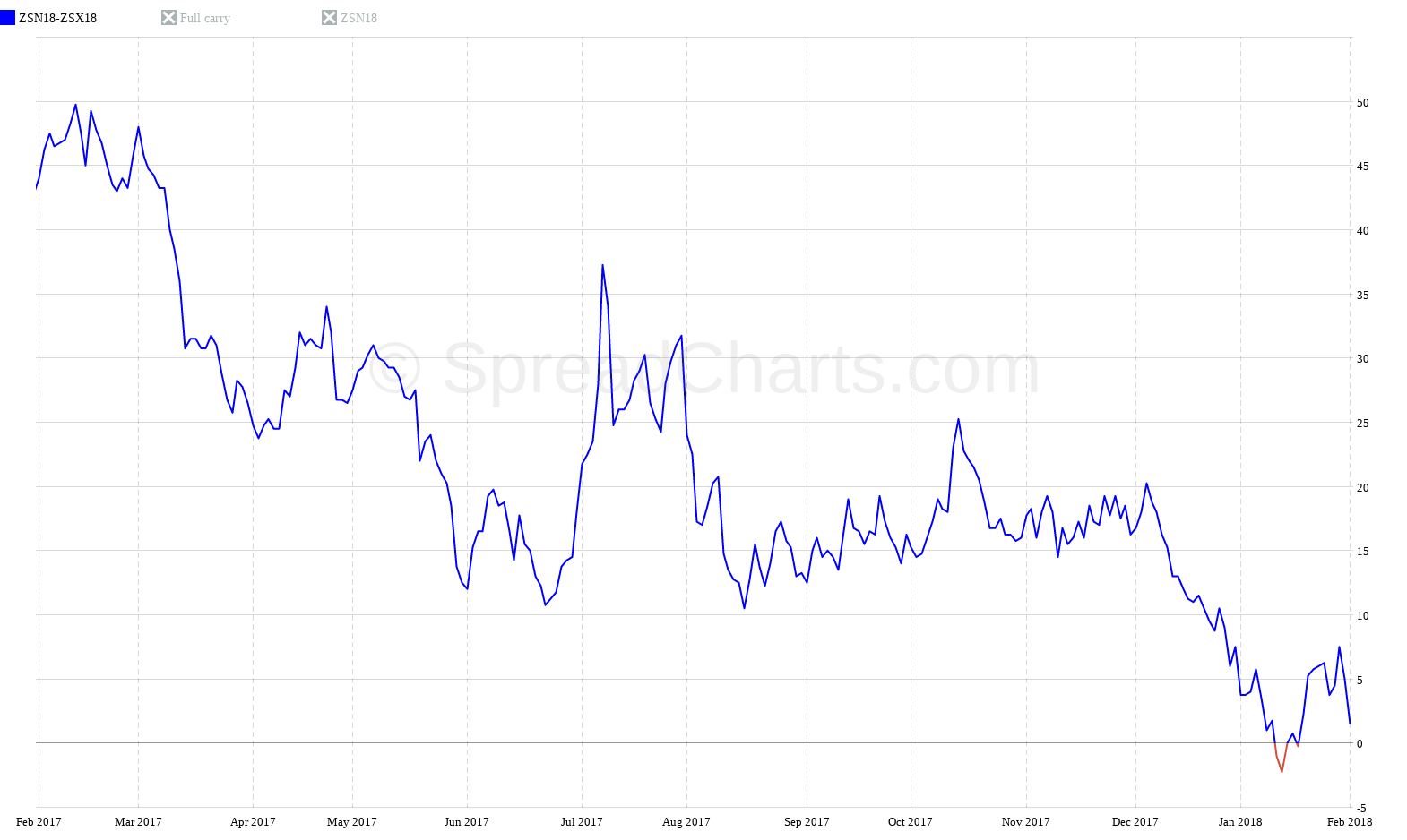 Nejoblíbenější je bull spread mezi dvěma sklizněmi, tzn. červenec – listopad (pro tento rok je to konkrétně ZSN18-ZSX18). Na následujícím grafu můžete vidět jeho vývoj za posledních 10 let. Je zjevné, že spread dokáže být v některých letech velmi zajímavý. Poměr podstupovaného rizika k výslednému zisku zde může být velice zajímavý.