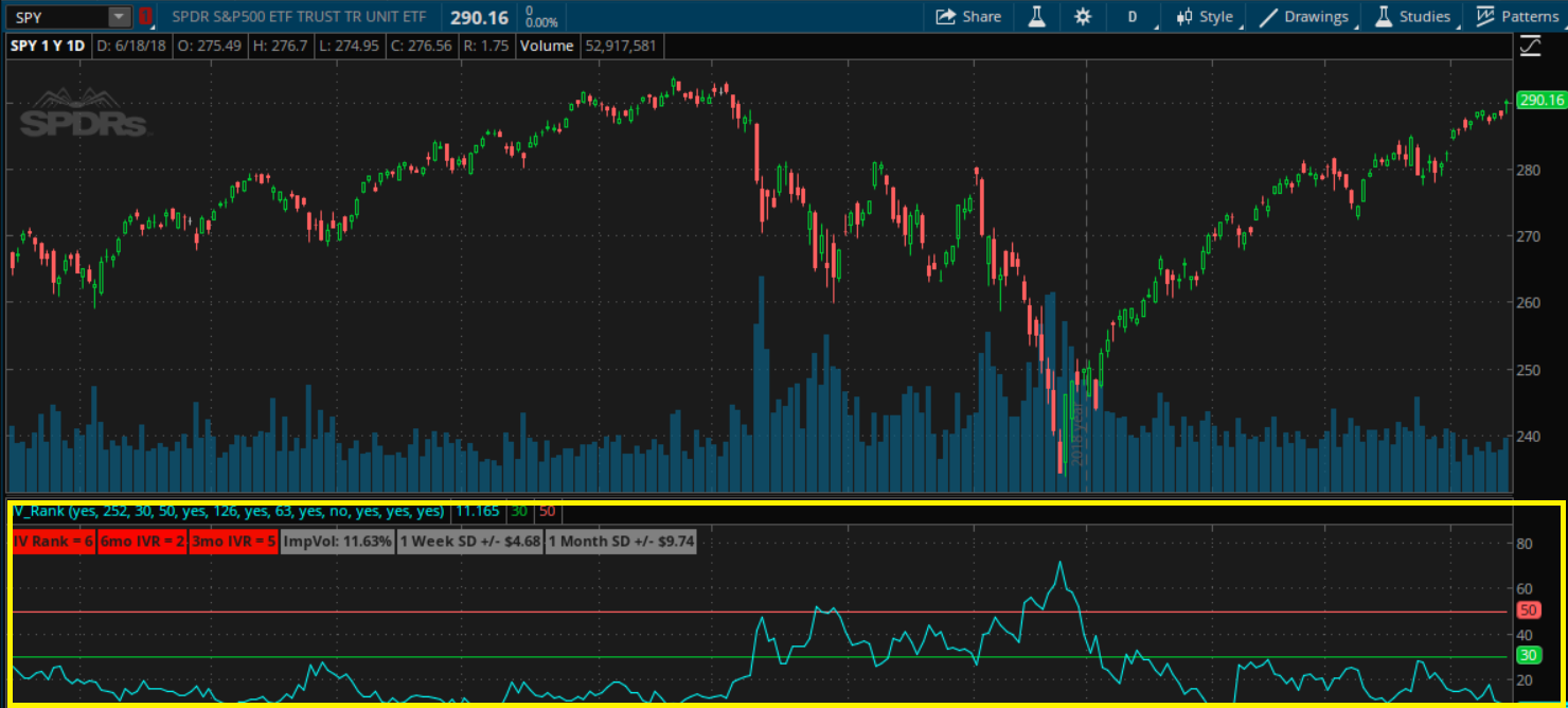 AddLabel(DisplayIVPercentile , Concat(“IV Rank = “, AsPrice(Round(Percentile, 0))), color = CreateColor(255-(Percentile*2.55),Percentile*2.55,0));